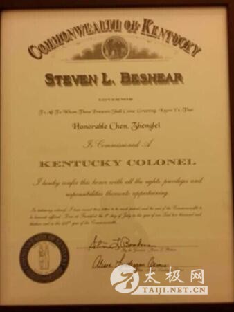 2014年7月6日晚上(美国时间),第二届国际太极拳论坛在美国肯塔基州隆重举行。太极拳各门派代表人物与400余名太极拳爱好者从美国、中国、澳洲、墨西哥、阿根廷、英国、法国等地汇聚到美国中东部,共赴这一太极盛宴。 陈氏太极第11代嫡宗传人陈正雷老师在陈斌和陈娟的陪同下代表陈氏太极拳出席了本次论坛,并与杨、武、吴、孙等五大流派代表人杨军、钟振山、马海龙、孙永田四位老师以及中国武术协会常委康戈武先生一道被授予“肯塔基上校奖”,这是肯塔基州的最高荣誉,由路易维尔市市长颁发证书,美国国会议员、斯波尔丁大学校长等纷纷到场祝贺。 作为中华传统文化的传承人和传播太极健康生活的使者,陈正雷老师一生以“弘扬太极文化,造福人类健康”为宗旨,四十余年来呕心沥血奔波于海内外传播国术家学。陈老师获奖后表示,这个奖曾经颁发给拳王阿里、中国工程院院士陈清如等名人,我能获得这个奖不是因为我个人做了什么,是因为中国太极拳切切实实给全世界人民带来了健康与和谐,也希望被美国学者称为“最完美运动”的太极拳今后能够继续造福中美各国百姓,为中美人民架起一座文化交流和友谊沟通的桥梁。 |