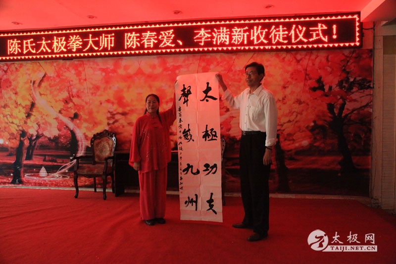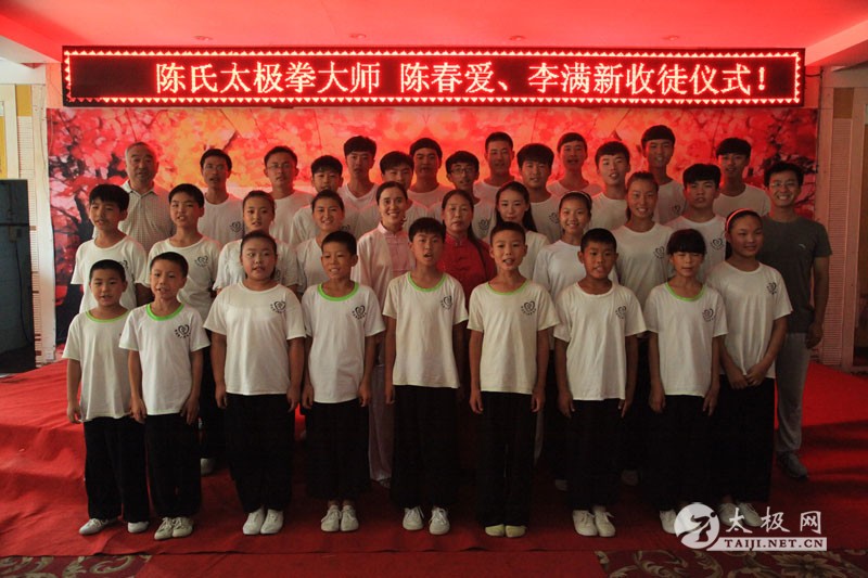 陈春爱与弟子们合影 太极网讯: 昨天中午,温县银苑大酒店一楼宴厅热闹非凡,陈家沟太极拳名家陈春爱的收徒仪式在这里隆重举行。张凯、刘益宾、赵江寒、王谱、王涵、郑利涛、张彪、张亚飞、王帅龙、张思茨、王坤浩、候茗轩、许埕旗、姚程露、段继文、黄帅林、王琦、郑佩华、陈鹏宇、陈震宇、陈腾宇、刘家磊、郑鑫、王靖凯二十四名新弟子拜陈春爱、李满新先生为师。 拜师仪式上,新入门弟子分批宣读了拜师帖,表示自愿拜在陈春爱、李满新老师门下,刻苦学习陈式太极拳,团结同道,为发扬陈式太极拳而努力奋斗。 弟子们表演结束后,陈春爱老师亲自演练了一套太极拳,潇洒飘逸的拳姿使掌声经久不息。