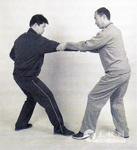 图1 手挥琵琶式的姿势要领: (以左式为例)左足在前,右足向后,身体重心在右足,左足足掌着地成虚步;左手在前,右手在后,两手与地面平行;左手五指伸直,虎口朝上,掌心向右向前平直伸出;右手虎口朝上,掌心向左,小臂平伸,肘尖靠肋,置于胸前;两手间横向相距约二寸许,右手指尖对左手腕纹线;两肘下垂;目视前方。 身体其它各部要求同于三体式,上体保持正直,头部虚领,胸部微含,腰部微塌,两腿微曲。周身放松(图1)。 手挥琵琶动作简练,可以直接和其它动作相承接。在孙式太极拳套路中它一般承接搂膝拗步、倒撵猴等动作。练习时要注意保持身体中正,不偏不倚,步法要与两手动作相协调,做到手到脚到,既要周身轻灵,又要劲整如一。 手挥琵琶式的用法: 对方用右拳击来,我略撤步,右掌接其腕,左手接其肘,顺势捋或撅(图2)。 图2 |