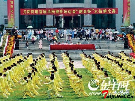 | 龙岗街道举办“千人太极拳”比赛,来自街道机关、九个社区的10个队伍在街道办大院广场一较高下。最后,龙岗墟社区、同乐社区、新生社区分别获得冠、亚、季军。这是龙岗街道为迎接大运会,鼓励全民健身而于今年8月开始举办为期四个月的全民健身运动会的重头戏。 |