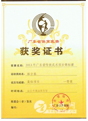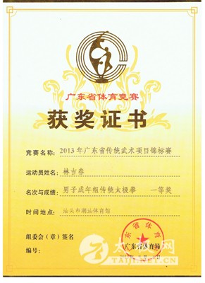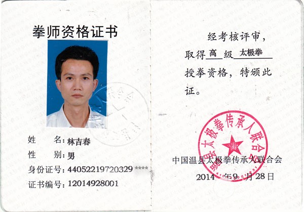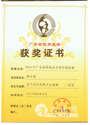 本人自小酷爱武术,青少年时开始习练外家拳,气功等。 2002年向一代宗师冯志强大师入室弟子黄光明老师学习心意混元太极拳及混元功。并多次上北京参加混元太极高级培训班,得到冯志强大师的精心指导。 2003年跟随陈向寅老师习练传统陈式太极拳老架,小架,竞赛套路,刀,剑,枪,春秋大刀,推手,散手等,对陈式太极拳理论造诣颇深,功力深厚,尤其对太极拳养生更深有研究,经多年的教学实践,整编了一套具有独特风格和养生效果的养生功《极益太极养生功》,更是得到高度的认可和大力的推广。 2006年正式拜师,成为陈氏太极拳第十三代传人。 2007年在汕头市“永衡”杯粤东,深,港,澳武术大赛荣获传统套路金奖,传统单剑金奖,单刀金奖。 2008年广东省传统武术项目锦标赛荣获男子传统套路金牌,国家竞赛套路金奖,单剑金奖。 2011年大潮汕“邓老凉茶”杯武术百馆精英大赛 荣获集体一等奖,竞赛套路二等奖,单剑一等奖,传统太极拳一等奖。 2013年广东省传统武术锦标赛荣获男子传统太极拳一等奖,集体一等奖,竞赛套路二等奖,单剑一等奖。 2014年经河南温县太极拳传承人联合会考核评审取得高级拳师资格。同年开始被多家学校聘请进校开设太极拳课堂,以“弘扬太极文化,增强学生体质”为目的,深受好评!多次组织参加表演和比赛均取得优异成绩。 2015年广东省第八届武术精英大赛(广州总赛区)荣获集体金奖,国家规定竞赛套路银奖,单剑金奖,传统太极拳金奖。 2015年广东省第八届武术精英大赛(粤东赛区)荣获国家规定竞赛套路金奖,陈式单剑金奖,陈式单刀金奖、陈式太极棍银奖、陈式传统太极拳金奖。 2015年广东省粤东首届健康运动大会荣获国家规定竞赛套路金奖,陈式单剑金奖,陈式太极棍银奖、陈式传统太极拳金奖。 2016年饶平县老干部(老年)大学开办太极养生专业班,被聘任为专职教师。向离休老干部传授太极养生功及太极拳,更是受到一致的认可和好评! 中国武术协会会员,广东省武术协会会员,中国武术段位六段,国家二级裁判员。 汕头市武术协会理事,一级教练员、一级武师。 林吉春获奖证书 林吉春陈式竞赛套路 林吉春陈式太极单剑 |