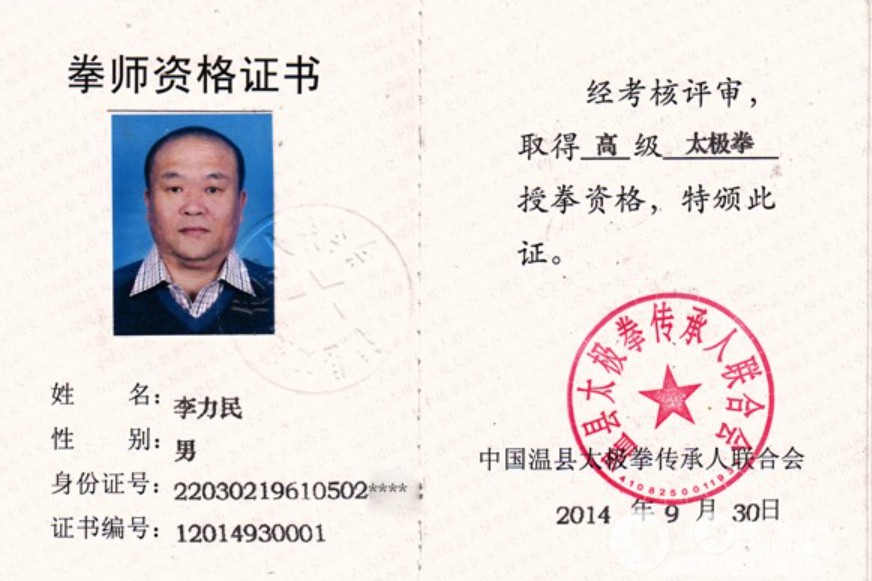 李力民先生是陈式太极拳大师马虹先生的入室弟子、陈式太极拳第十二代传人—— 中国武术六段位。多次获得国际国内太极拳比赛金奖。 李力民先生,跟随马虹大师多年,深得马老亲传,拳架工整,周身一家,发力松活弹抖,功力十分深厚,弹抖力惊人。平时深研太极理论,授课细致入微。 李力民老师传授的学员在2013年的北京太极拳比赛和石家庄“马虹”杯及2014年北京太极拳比赛中均取得了不菲的成绩。 我爱太极拳之北京陈式太极培训站,自2005年7月由李力民老师创建以来,学员数以千计,遍布全国各地,其中也不乏爱好太极拳的外国友人。多次受到美英,加拿大等欧美太极拳爱好者的邀请,对他们进行授拳,讲课。本培训站积极响应国家的全民健身的号召,面向全社会招生,常年办班,并承接企事业单位的陈式太极拳培训,本辅导站遵循马老在多年教学过程中始终倡导的原则——“教拳、交心、交朋友,练拳、练体、练人格”,并以马老所论述的“太极美”(造型优美,刚柔并济,充满对称和谐之形,波浪节奏之姿,轻沉兼备之态,气势磅礴之势,外示安逸之神,给人以潇洒而沉厚、轻灵而凝重、舒展而紧凑、悠扬而庄重、情景交融的意境之美)为教学指导,致力于传播、传承太极武术及其所蕴含的中华传统文化。 李力民证书 |