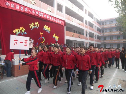 天高云淡,秋风送爽。值此金秋时节,2007年10月25日上午8:00,中牟县直第一小学举行了盛大的2007年秋季体育运动会开幕式。本次运动会是在全国正式启动“阳光体育运动”,全面推进学校体育运动,全民树立“健康第一”、“每天锻炼一小时,健康生活一辈子”的健康生活理念,以实际行动迎接2008年北京奥运会的大背景下举行的,这次体育运动会的主题是:阳光•运动•健康•和谐。只见新铺的操场上口号振天,男儿飒爽,巾帼抖擞,全体师生迈着矫健的步伐,组成一个又一个方阵,接受检阅。 六一班方队正在接受检阅
