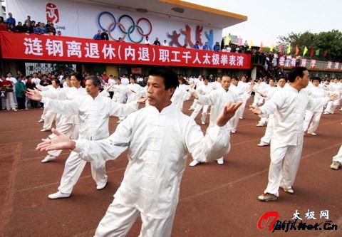 | 2007年11月2日,许多湖南涟钢离退休老职工在参加千人太极拳表演。湖南省娄底市涟钢集团有限公司为宣传奥运会精神,开展“与奥运同行,与健康同行”千人太极拳表演活动.一千多名离退休老职工踊跃参加“与奥运同行,与健康同行”千人太极拳表演和比赛。图为表演者展现太极拳。 |