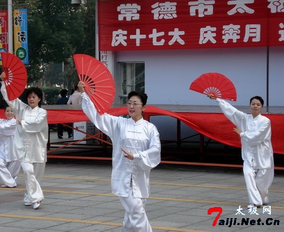 11月4日,由市太极拳协会举办的“庆十七大、庆嫦娥奔月、迎奥运太极拳展示活动”在市城区举行。图为太极拳爱好者表演的太极功夫扇。