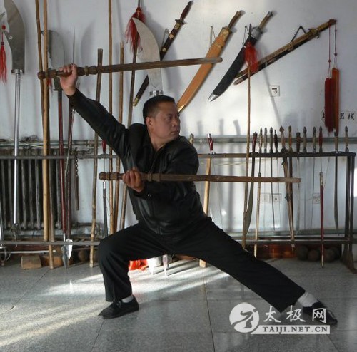 根据陈家沟所传,陈式太极拳器械有刀、剑、枪、棍、锏、双人粘枪、杆等。其中双人粘枪及杆最具独创性,将陈式太极拳与众不同的缠丝劲用到长兵器上,为长兵器对练开辟了一条简便易行、迅速提高技术的途径,同双人推手一样,开辟了武术中的新天地。器械套路在历代拳师的共同努力下,不断取长补短、推陈出新而日臻完善。古老的陈式器械套路多没有起势、收势,现代的大师们为使器械套路显得更科学、完整、严谨,多增加了此二势,本志所收录器械套路均采自当代名家著述。 太极单刀(又名十三刀)     陈式太极单刀是太极拳器械功夫套路中短器械的一种,古老套路只有13个动作,故称十三刀。套路短小精悍,势势用法逼真。它的滚、闭、扎、拦、劈、砍、撩、截、缠、抖、架、抹、挑等13种刀法,体现了陈式太极拳的刚柔相济、快慢相间、蹿蹦跳跃、松活弹抖、沾粘连随、缠绕旋裹的特点,确有刀如猛虎、力劈华山之势,并兼有短兵长用之法。     1930年至1938年,著名太极拳师、陈氏十八世陈照丕在南京授拳时,在十三刀的基础上,增加了9个动作,形成了现在流行的陈式太极单刀套路,陈式太极拳大架系多习练之。 太极双刀(34式)     陈式太极双刀是陈式太极拳器械套路中双兵器的一种。几百年来,34式双刀在陈家沟广为流传。套路布局合理,衔接紧凑,刀法清晰,用法逼真。它以劈、砍、撩、挂、扎、截、拦、压、推、抹、横、架及舞花等刀法,结合陈式太极拳舒展大方的身法,灵活稳健的步法,将陈式太极拳刚柔相济、快慢相间、松活弹抖的特点表现的淋漓尽致。 太极双刀(24式)     同太极双刀(34式)一样,也是陈家沟广为流传的太极拳器械套路,现陈式太极拳小架系多习练之。 太极单剑(49式)     陈式太极单剑是太极拳器械套路中短器械的一种,几百年来,在陈家沟广为流传。 太极双剑(39式)     太极双剑是太极拳器械套路中双兵器的一种,套路中有刺、点、撩、挂等剑法,配合太极拳缠丝劲,动作灵活多变,腕力突出。 太极十三杆(13式)     又称陈式太极十三枪(加上枪头即为枪),是陈式太极拳器械套路中长兵器的一种。杆采用三米多长、尾部较粗的白蜡杆制成。套路短而精,没有舞花动作,一招一式用法逼真,威力无穷。它以劈、崩、点、穿、挑、拨、扫等枪法合以沾、缠、绞、拦、披、崩、拖、挂、横、扎、抖、架、挑等杆法,方便灵活,机巧多变,独具特点,是陈式太极拳器械中的佼佼者。 太极二十四枪(24式)     是博采众家枪法之长,融入太极拳功法所形成的套路。 太极枪(77式)陈式太极枪亦名“梨花枪夹白猿棍”,是陈式太极拳器械套路中长兵器的一种。它汇集枪、棍的特点,在实战应用中,既有枪扎一条线,又有棍打一大片的技击效用,结合陈式太极拳中缠绕沾粘法,故称“陈式太极枪”。 太极单锏(34式)     太极单锏是太极拳器械中单兵器的一种,原为铜铁所制,现多木制。一般长70~90厘米,锏柄尾有孔,可穿绳套,用于套腕。锏身方形凹面,四边角凸起成棱,无刃无突,故又有“凹面锏”、“方棱锏”之称。单锏练习与运用在手、眼、身、法、步相结合并与内劲协调一致的基础上,结合掤、架、推、挂、截、点、压、横、拦、劈、砸、舞花等技击方法,体现出刚劲勇猛、力大无穷的神威。 太极双锏(28式)     太极双锏是太极拳器械套路中双兵器的一种,套路中配合陈式太极拳的手法、身法、步法,有各种挂、截、点、压、横、拦、劈、砸等锏法。现习练者不多。 太极春秋大刀(37式)亦名“青龙偃月刀”,是陈式太极拳器械套路中长兵器的一种,     套路名称由三十句歌诀组成,与其他套路名称不同。其他套路一个名称基本上是一个动作,此路刀一句歌诀包括几个动作。 太极棍(24式)     棍是原始的长兵器械。太极棍在演练时动作走圆弧,棍的扫、挑、扎、抖、崩、护要随身催动,左旋右转,前进后退,一气相连,人棍合一,刚柔并济。 太极齐眉棍(17式)     棍子立于地,棍高以眉齐为度。有劈、崩、点、拨、拦、封、撩、扫、缠绕等棍法,演练时要手臂圆熟,身棍合一,力透棍尖。双手执棍开合,旋转时要圆熟自如,舞棍时要求手、眼、身、法、步协调合一。 太极双棒棰(33式)     棒棰亦称棒槌,是用来捶打的木棒,多用来洗衣服、布匹。太极双棒棰是将生活用具化作武术器械,将太极拳的手法、步法、身法融入棒槌中。古代多为女子习练,现会者、练者较少。 太极狼牙棒(36式)     狼牙棒系木制,长4~5尺,粗大的一端表面用铁皮包裹并带有铁钉,形似狼牙,故名狼牙棒,是一种古老的打击用冷兵器。 太极单锤(28式)     为长柄单锤,技法有涮、曳、挂、砸、擂、云、盖等。武术谚语说:“锤走曳式。”  |