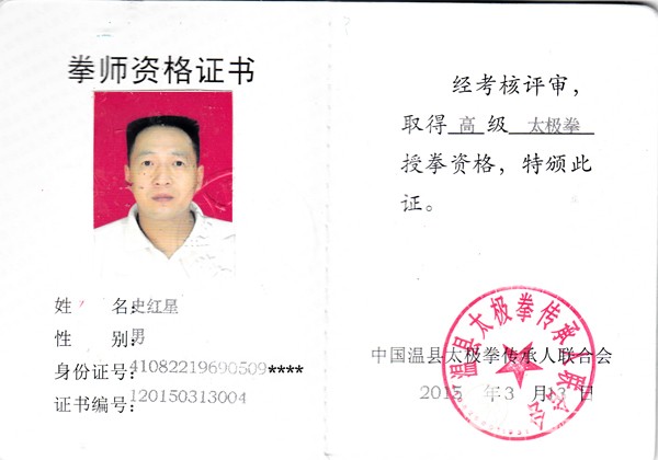 史红星,男。生于一九六九年五月初九日,河南省博爱县金城乡史庄村一号,自幼习武,一九八三年于河南嵩山少林武术学校习武,一九八六年被选少林武僧后备队,一九八八年回家以教拳为职业,研究八极拳,形意拳,心意六合拳,八卦掌,通背拳,三皇炮拳,大成拳,戳脚,翻子拳,泰拳,跆拳道,散打,摔跤,擒拿格斗等。一九八九年八月十五日拜陈氏太极拳十一代传人陈德旺为师,一九九八年拜和式太极拳第六代传人皇甫尚湖为师,二零零八年加入河南省武术协会,常年在外和女儿教拳为职业。 |