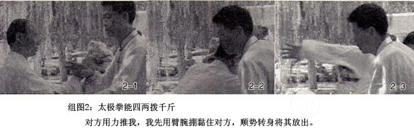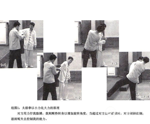 太极散手是太极拳的全面实战应用,适用于对各门派武术的较量及各种没有规则限制的搏斗。     大家经常看到的太极拳表演,出于观赏需要过于舒展,而养身太极拳又柔软有余,两者都不具备杀伤力,因而给人留下的感觉是太极拳不适合实战博击。为了阐明太极拳在散手实战中可以后发制人、以柔克刚、以小力破大力的原理,本文对照实际应用对其进行剖析。 一、太极散手切入的方式     俗话讲“先下手为强”,这句话表明先动手有利于打击对方。但太极散手讲究后发制人,这似乎与常理相悖,实际上太极散手要求的是后发先至。     太极散手采取“后发制人”的方式与人较量。古谱讲:“求势争来脉。”要取得有利的形势,须先知道对方的意图,待其先出手暴露意图时,我再“有的放矢”,这样做,虽然我后动手,却取得了主动权。因此,太极散手求势之道,始于双方在“打击射程”之外的对峙,进入比拼之前我已全神贯注,以静待动,沉着应战。此时我全身内气运转,含机待发,身形架势根据对方动作变化进行相应调整,等待对方向我进攻。对方上步进身,不管其速度多快都有个时间差。当对方脚要落步时,我已判断准确,计算好量;对方脚刚挨地,我已步随身进,踩到我顺彼背的位置;对方站定出招,我已格闪进身使其打空,趁机运用恰当的招式将彼发出。如果对方能化解我的还击,双方则进入短兵相接阶段。只有敢于把对手放进来近身较量,太极推手才有用武之地。 二、太极散手的近身实战     1.太极运劲的方式     太极拳将千变万化的招式归纳为掤、捋、挤、按、采、挒、肘、靠八种劲法,进、退、左顾、右盼、中定五种步法,及阴阳变化之术,再将这些内容融入到太极运行方式中。只有懂劲法,知阴阳之理,虚实变化得当,过招时才能运用自如。为了便于说明太极劲法的相生相克,特将四正推手 的关系抽象为:捆生捋、捋生按、按生挤、挤生掤,掤克按、捋克掤、挤克捋、按克挤。用劲法赢人,可无招胜有招,实为劲中含招。太极周身一家,一动无有不动,每一式都需全身各部的运行及配合,欲左先右,欲前先后,相互依托,整体为用。形随劲动,而不是用力出形,这是太极运劲与直接用外力的不同之处。     太极拳的神韵在于内功,内功源于内劲的运用,内劲依靠内气通过太极运行方式实现以意行气、以气运身、气到劲到。     太极运动遵循人体结构运转规律,在意识作用下以丹田运劲,腰带动身体进行螺旋运动,腰向右转带动右腿至脚掌用劲顺时针碾地螺旋缠转向上经胯传导至左腿,促左腿逆时针螺旋缠转,使身体重心沿“~”轨迹从右向左移动,右腿渐渐变虚,左腿渐渐变实。双腿在这种互逆向运转中使身体向右螺旋转动,带动身体右侧向后转,右臂掌逆缠画弧,同时身左侧向前转,左臂掌顺缠画弧。“往复要有折叠,进退要有转换”,当重心移到左腿后,左腿至左脚掌再用劲逆时针碼地缠转螺旋向上经胯促右腿顺时针螺旋缠转,使身体变成左螺旋,重心沿“~”轨迹从左向右返回,左腿渐渐变虚,右腿渐渐变实,身转左螺旋,带动身左侧向后转,左臂掌变逆缠画弧,同时身右侧向前转,右臂掌变顺缠画弧。在这个运行过程中,身体在双脚之间运行了一个反“~”与一个正“~”轨迹,连接成一个“∞”路线,同时,身体在双腿逆向运转中进行了左右螺旋交替转动,双臂掌各自画了一个顺逆缠连接的螺旋圆弧,这样形成了在腰带领下的全身螺旋缠绕。劲由根节率领梢节运行,可做到全身松而不懈,自行调整中正,抱撑八面。做杨式太极拳的 “云手”定步动作,可体验这个运劲感觉。身体重心沿“∞”路线运行,内气在足、腿、胯及身体各部松开协调配合下,依序节节贯穿,连绵不断循环运行,形成整劲。“∞”符号只是太极拳的内在运行规律示意图,并非太极拳的每一式都刻意按照这样一个模式去运作。掌握了太极拳的运劲方法,在散手搏击中就能随心所欲,心意一动劲就进行虚实变化,身体处处可化、处处可打。这种“∞”运行是立体的、全方位的,有时甚至是无形的,其角度及弧形大小随太极拳动作而变化。这种运行方式在体内出现互相对称的反向劲,客观上起到了自行调整身体平衡的作用,在与人交手时保证了身体的中正稳定。     太极不是定向转动,身体随着“∞”路线往复运动中螺旋转动变换方向,左右螺旋的螺旋劲都是向身后侧转、向下旋。“折叠”绕回前时,螺旋劲向上进。这种太极劲受到外力时,在身臂配合下可左右逢源,将来力带向对我用力一侧之外,客观上有助于我螺旋劲脚碾转于地,加强了脚底生根,使身体稳定。返回前时,如千斤顶,劲源源不断将对方推仰,使其足根拔起。另外,太极“∞”往复运行方式产生的来回劲,可迅速、灵活地变化运转方向,在近身纠缠中可顺对手用力方向随时将他放出。     太极散手以防、化为先,化中能打,变劲极快,除了需要运劲连贯外,还必须虚实转换灵活,因此既不允许两腿平均用力支承身体的“双重”出 现,又要避免采用虚实分家、棱角分明的弓箭步,要求屈膝圆裆、松腰落胯,实腿不可全然站煞,虚腿不可完全没劲,全身要能够松、整、圆、活地运动。     有很多太极拳习练者,打拳套路娴熟,也掌握了各式的攻防含义,但实战应用时就不灵验,主要原因是没有把太极招法与全身运劲的方式联系起来,当打拳与运劲脱节,肢体各自为阵用力出招换式