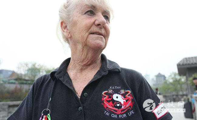 凯西穿的太极服胸前绣着她们自己设计的由龙、太极等图案,还有“TAI CHI FOR LIFE”( “太极为了生命”)的标示。 凯西告诉记者,她这次来中国旅游要在西安呆五天,听说,环城公园里有不少太极拳“高手”,她便慕名前来了。