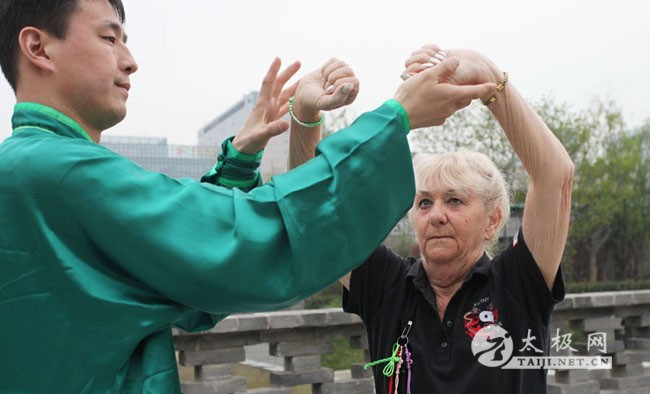| 4月14日,西安环城公园,来自澳大利亚的71岁凯西女士跟着80后太极拳老师赵庆练了一天太极。 凯西开心极了,她说,太极拳、兵马俑、熊猫是她这次中国之旅最喜欢的三个宝贝。