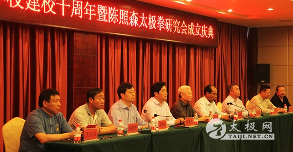 五一国际劳动节,陈家沟王庭酒店热闹非凡,陈家沟太极拳功夫学校的学生齐聚一堂为陈家沟太极拳功夫学校十年校庆暨陈照森太极拳研究会成立仪式庆祝。 焦作市太极拳协会会长赵功佩,焦作温县人民政府副县长张金太,温县体育局局长宋明军,陈家沟太极推广中心主任陈皂罗,广东客属文化产业开发投资有限公司董事长郑辉宇,太极网总经理刘洪奇以及太极拳杂志主编王娟,纷纷向陈家沟太极拳功夫学校校长陈照森先生表示祝贺。