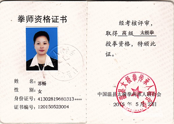 陈式太极拳传承人苏畅荣获太极拳高级拳师证书
