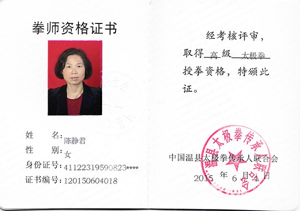 陈式太极拳传承人陈静君荣获太极拳高级拳师证书