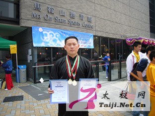 | 第六届香港国际武术节于2008年3月11日闭幕。此次赛会喜逢奥运,作为香港地区迎奥运的重要活动之一,本届赛会以“迎奥运杯”香港国际武术节命名;而且奖牌设计及材质均借鉴2008年北京奥运会的奖牌设计风格,制作了金属镶玉的“武之玉壁”奖牌,以此展现中华民族悠久的武术文化特色和民族传统气息!来自美国法国俄罗斯等30多个国家和地区三百余支代表队的三千六百多名运动员参加了本次大会。合肥陈氏太极拳馆也派代表队参加了本次武林盛会,在强手如云的赛场上,倪世清总教练凭借扎实的功力获得传统太极拳和太极大刀两项第一名的好成绩,为安徽合肥人民争了光。 |