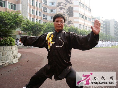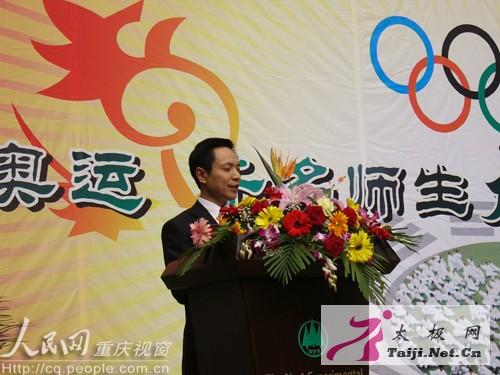 | 学校师生正进行太极拳表演 人民网重庆视窗4月8日电 魏星报道:当北京奥运圣火在境外传递进行得如火如荼之时,奥运热在重庆也不断升温。今日上午,重庆市九龙坡区第一实验小学举行“迎奥运千名师生太极拳表演活动”,2000余名师生通过齐舞太极拳,表达了对北京奥运会的热切期盼。国家体育总局局长刘鹏为活动发来贺信,感谢学校师生对北京奥运会的支持,并祝活动取得圆满成功。 重庆市九龙坡区第一实验小学校长陈光培在活动前致辞 太极大师王西安嫡传弟子申昌明在学校任教 |