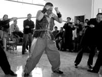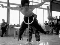 小隐隐于野,大隐隐于市。昨日,成都青龙场,黄明生家刀光剑影。邻居莫不称奇:“这么多年,怎么没发现身边居然暗藏着一位武林高手?黄老这次出手,莫非这个春天,江湖有什么大事要发生?”本报记者林小明为您摄影报道 记者昨日赶到现场时,此处已是热闹非常。各路好汉早已落座,讲述着武林中的传奇和逸事。很多早已淡出武林的前辈也赶到了现场。他们重出江湖,莫非江湖真的又会掀起什么风浪? 记者将目光探向62岁的主人———黄明生老人,只见他慈眉善目,身体魁梧,说话轻言细语,但在谈到武林时,眼中顿时精光毕露,神采奕奕,让人得以窥见武林大师的英雄本色。据黄明生介绍,他从13岁开始学习武术,并遍访名师,最终练就一身过硬的武功。1980年,黄明生在参加全运会武术表演项目中,一举获得了气功类冠军。后来,黄在深圳体育馆接连表演了三场气功绝技和搏击等,很多武林后生纷纷前往学艺,他一时名震江湖,但后来,江湖忽然不见其露面,于是,人们纷纷传说他隐居山野修炼某种盖世奇功。此番他再度出山,那一定是有大事发生。 忽然,“滚地龙”王彬手舞双刀,“呼啦”一下跳入场中。俗话说,长枪靠抖,双刀靠走,只见王彬步子轻盈地游走着九宫八卦步,双刀前后翻飞,根本分不清哪里是人,何处是刀。紧跟着,他一个“枯叶落地”躺在地上,织出一张刀网裹着身躯蛇行,让人看得目不转睛,大气都不愿喘。“啊,地躺刀!”有人惊呼,“这就是韦小宝当年大败俄罗斯火枪手的地躺刀!” 左腿毒蛇出洞,右脚燕子三抄水,迎面猛虎一回头,摆首虎鹤显双形……随后,张一和武飞各以散打和少林五形八卦拳引来如潮掌声。 内行看门道,外行看热闹,他们究竟要干什么? 天啦!你看王云华,气沉丹田,将小腹顶在锋利的钢叉上,滴溜溜地在空中转圈,看得人大眼瞪小眼,但是,钢刀一点都没扎进他肉里。可王彬毫不示弱,将铁枪尖顶在咽喉处,把一辆长安面包车顶得飞跑,连枪都弯了,他的咽喉竟安然无恙! 在武林同道和弟子的高呼声中,主角黄明生登场了。只见一根粗大的绳子套在他脖子上,左右两端各有8名大汉使劲拉紧绳子。“哎哟!他们是来寻仇?还是要了却什么江湖恩怨?这不把他老人家勒死才怪?”别着急,且看黄明生面不改色,双手将绳子轻轻把住,猛地发力,16名大汉叠罗汉样纷纷倒地。壮汉们刚起身,黄明生“狮子猛摇头”,16名大汉个个被摔个趔趄。 黄明生抚掌哈哈大笑,端坐椅上,一群武师装束的人忽然跪地叩头:“弟子们献丑了,师傅生日快乐!”围观者虚惊一场,原来是大摆武术寿筵,功夫表演权作下酒菜。 黄明生这才告诉记者,其实他已经退隐了很多年,也没有想过要过生日,由于武林同道纷纷表示要以此来聚会,共同交流和切磋,他才勉强同意,想不到生日会过得这样热闹和精彩。 |