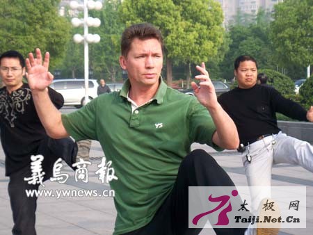| 用“眼”学会传统85式杨式太极拳 光用眼睛看,便能把一套传统85式杨式太极拳打得像模像样、步履轻盈、招式有力、动作舒展,俄罗斯外商保尔不愧为练武奇才。4月28日,他将代表义乌去参加金华市太极拳团体比赛。 其实,保尔学太极的时间并不长,去年11月,首次来到义乌的保尔,在绣湖广场上撞见了正在此教授太极拳的师傅朱现红。看到朱师傅打得非常好,一直希望学习太极功夫的保尔动心了。他托翻译把自己渴望拜师学艺的想法传达给朱现红。上世纪80年代,长期从事柔道运动的保尔从书中了解到太极拳,当时就被这种刚柔相济的太极拳迷住了,可惜苦于没有找到一位好师傅。朱师傅也非常愿意把博大精深的中国功夫传授给外国友人,两人一拍即合。此后,只要不下雨,每天早七点和晚七点,保尔就会准时出现在广场上。 与中国人学太极不同,由于语言不通,保尔并不能与师傅对话沟通,所有学习必须通过眼睛来完成。每一个动作,保尔先认真看老师做,然后自己照样比划动作,有时候他还在家中跟着碟片练习。朱师傅发现,这位俄罗斯徒弟悟性极高,动作到位,而且能深刻领会每一个动作的内涵。一次,保尔的翻译在场,朱师傅欣然表示要收保尔为入室弟子,保尔笑着直点头。 断断续续学了几个月时间,现在,保尔已完全掌握了复杂的传统85式杨式太极拳的动作要领。他说,和其它硬功夫相比,太极拳对自身没有破坏性,而且能打通全身血脉,练完太极拳后顿时感觉神清气爽。