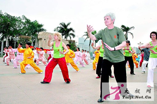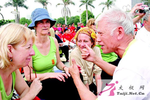 腰鼓开场迎接法国友人 早上7时30分,当记者来到邕江桥南的江滨公园时,上千名老年朋友已经早早在此等候,腰鼓队敲起了欢快的腰鼓。 随后,一群法国的老年朋友出现在人群中,更热烈的腰鼓表演迎接外国朋友的到来。而精彩的中国传统舞狮表演将整场的气氛推向了高潮,法国老年朋友还兴致勃勃地走上舞台和南宁的老年朋友一同打起了24式太极拳。 法国布雷斯特太极功夫学校的校长苏韧屏女士告诉记者,这群来自法国的老年朋友一行有19人,年龄在50—76岁之间,他们都是中国太极拳的忠实爱好者,练习太极拳短的有1年,长的达12年之久。 此时,一名年轻中国小伙表演起了太极柔力球,吸引了法国友人的目光,他们不断鼓掌叫好。小伙子姓莫,是太极柔力球老师。表演一结束,不少法国友人迫不及待地上前想拜师学艺。尽管语言有差异,却丝毫不影响他们的交流和沟通。这不,小莫一板一眼地示范,法国友人则在一旁不停地竖起大拇指。 法国友人支持北京奥运 通过苏韧屏女士的翻译,记者与两位法国友人聊了起来。他们告诉记者,在印象中,中国人很热情也很友善,他们从法国特地来中国参加这样的迎奥运活动,将在中国停留16天,随后将前往上海。他们喜欢中国传统的文化,自己就一直在练习中国的太极拳。 当问到对2008年奥运在北京举行有何看法时,法国老人说:“奥运无国界,奥林匹克精神属于世界人民,我支持奥运会在北京召开。奥运是世界和平人民的运动,不应当受到任何外界的干扰,我祝福北京奥运能圆满举行。”
