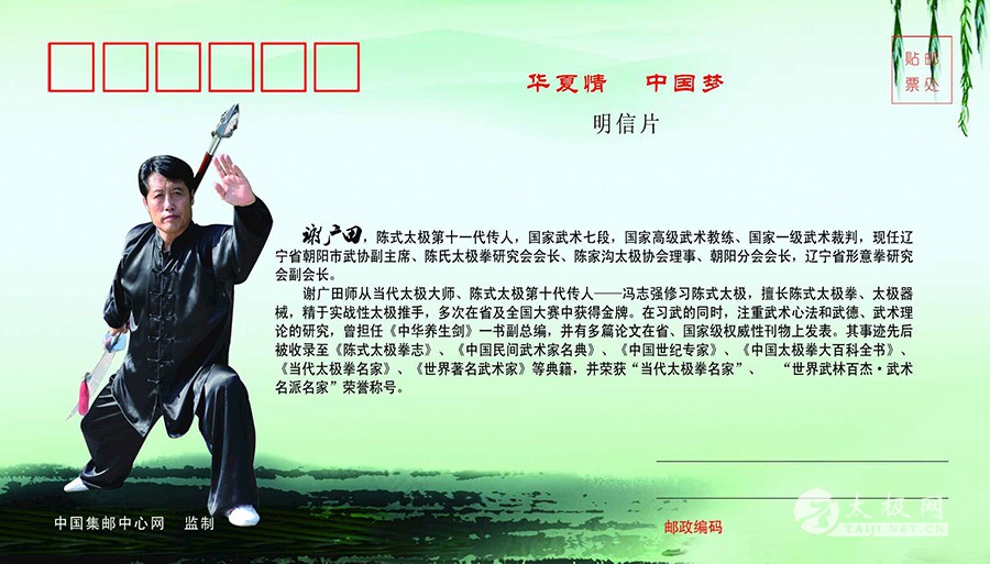 “华夏情,中国梦”纪念珍藏邮册由国家邮政、电信部门严格审批的盛世典藏纪念邮票精品,于2015年正式向全国发行。其以“和谐”标志印载的多种纪念邮票、明信片、电话卡,公开地向世界推出了太极名家谢广田(辽宁省朝阳市武协副主席)个人的拳、剑,春秋大刀等武术图案。 在纪念珍藏册中,发行部门撰文称:“邮票素有‘国家名片’之称。以‘华夏情·中国梦’为主题的中国邮册,是中国集邮中心网与国家邮政、电信等部门深度合作,为当代知名艺术家及社会知名公众人物精心设计和发行的纪念珍藏邮册。” 谢广田,陈式太极第十一代传人,国家武术七段,国家高级武术教练、国家一级武术裁判,现任辽宁省朝阳市武协副主席、陈氏太极拳研究会会长、陈家沟太极协会理事、朝阳分会会长,辽宁省形意拳研究会副会长。 谢广田师从当代太极大师、陈式太极第十代传人——冯志强修习陈式太极,擅长陈式太极拳、太极器械,精于实战性太极推手,多次在省及全国大赛中获得金牌。在习武的同时,注重武术心法和武德、武术理论的研究,曾担任《中华养生剑》 一书副总编,井有多篇论文在省、国家级权威性刊物上发表。其事迹先后被收录至《陈式太极拳志》 、《中国民间武术家名典》 、《中国世纪专家》 、《中国太极拳大百科全书》 、《当代太极拳名家》 、《世界著名武术家》等典籍,并荣获“当代太极拳名家”、“世界武林百杰• 武术名派名家”荣誉称号。 |