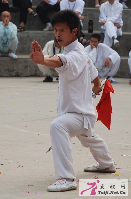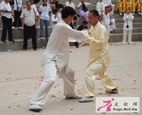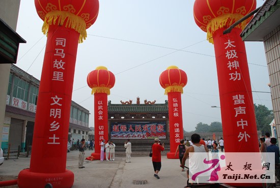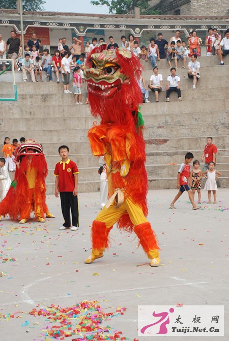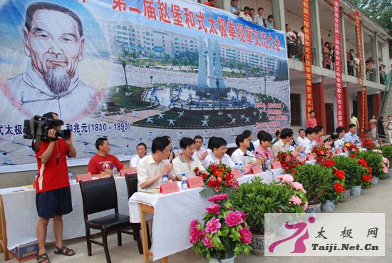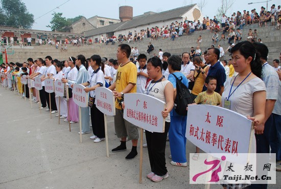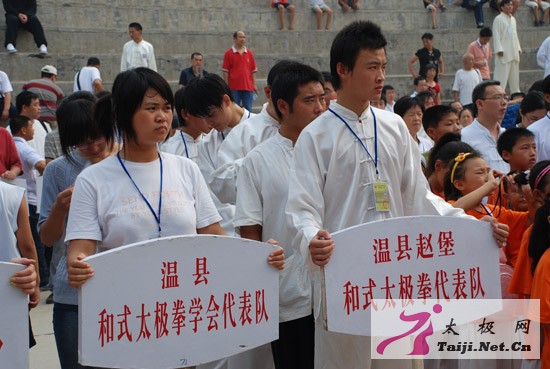 2008年7月11日上午,第二届赵堡和式太极拳观摩交流大会开幕式在赵堡和式太极拳的发源地温县赵堡镇举行。 恰值盛暑,烈日当空,骄阳似火,来自全国各地的和式太极拳协会组织以及当地村民汇集在了赵堡村委大院,这让本来还不算小的村委大院一时间摩肩接踵、人声鼎沸。在村委会大楼正中悬挂着一副巨大的大会背景图案上的和兆元正安静地注视着眼前这热闹非凡一切。和式太极拳传承近二百年,而全国性的和式太极拳观摩交流活动还是第一次在他的家乡——赵堡镇举行。 简短的入场仪式之后,全国各地协会组织在会场中央列出了整齐的方队,每列队伍之前的牌子标明了他们来自何方。几十列队伍,几十面牌子也可以表明发展相对滞后于陈、杨、武、吴、孙五大流派的和式太极拳现在已经花开遍地、风行天下了。队伍当中,我们能看到花甲老人、稚嫩顽童,当然还有英姿飒爽的巾帼英雄。骄阳之下,他们虽然挥汗如雨,但一个个看起来依然是热情不减、意气风发。在他们的眼神里,我好像隐约觉察到太极拳给他们带来的应该不仅仅是身康体健。 九点整,县市领导、和式太极拳当代主要传承人和有禄、和定乾以及各地和式太极拳的代表在主席台依次就坐。来自全国各地的和式太极拳爱好者共50个代表队参加了开幕式,焦作市宣传部长秦海彬、焦作市太极拳研究会会长、原市政协主席赵功佩、副会长穆玉华、焦作市体育局局长刘新顺、温县县委书记董安民、县委副书记、县长魏曰高、政协主席周青水、县委办公室主任秦迎军、县体育局局长宋明军等领导出席了开幕式,开幕式由温县人民政府副县长孙菊梅主持。县委副书记、县长魏曰高,焦作市体育局党组书记、局长刘新顺,清宫酒业有限公司总经理王集体等分别致词。魏曰高代表县委、县政府对第二届赵堡和式太极拳观摩交流大会开幕表示祝贺。之后,裁判员代表和参赛选手代表分别上台发言宣誓。 几声礼炮声响后,会场上空瞬间被漫天飞舞的彩条所笼罩,精彩的开幕式节目表演开始了。 最先登场的是温县形真武校的舞狮队,大小三四只狮子在节奏清晰的锣鼓声中翻腾跳跃着入场了。只见这几只狮子在场地中央随着舞狮少年的引导,或是摇头摆尾、或是翻滚欢腾,又或是相叠立起,场面煞是热闹,而周围的观众也不时报以热烈掌声和叫好声。 随后入场的各地和式太极拳协会组织团体代表次序上场表演了传统和式太极拳套路以及让人眼花缭乱的各种器械表演。在整个表演过程中,观众席的掌声始终都是此起彼伏,叫好声也是接二连三地不断传来。 最后压轴登场的名家表演,和有禄、和宝森、和定乾等刚一入场就引来了和式太极拳爱好者的掌声和欢呼声。在他们的表演过程当中,很多太极拳爱好者和各方媒体都手拿dv、相机捕捉着自己需要的画面。 在阵阵掌声、欢呼声中,四位和式太极拳代表人物结束他们的精彩表演,而此次赵堡和式太极拳观摩交流大会开幕式也圆满结束了。这时候,会场四周的太极拳爱好者纷纷涌入会场里与和有禄、和定乾等人合影签名留念。 根据大会安排,下午将在武术馆举行桩上徒搏项目的比赛。 今天,我很多次听到了“和协”一词,这是大家对和式太极拳协会简称。“和协”音同和谐,意虽不同,但太极拳隐含的理念与国家倡导和谐理念却是相同的。愿中华武林和谐,愿我们祖国和谐! [page]  [page]