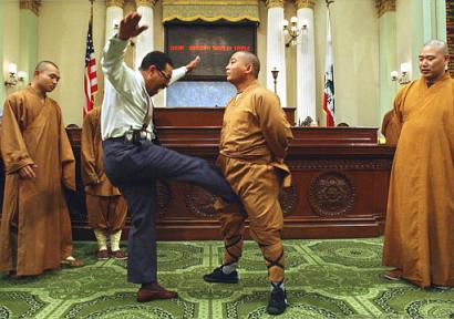 昨天,嵩山少林寺方丈释永信携28名僧众返郑,为期5天的美国加州“嵩山少林寺日”确立庆典活动就此落下大幕。 释永信方丈一行是3月19日应美国加州方面的邀请,前去参加“嵩山少林寺日”确立庆典活动的。每年3月21日为加州“嵩山少林寺日”,是被加州议会以立法的形式确立下来的,今年3月21日是加州的第一个“嵩山少林寺日”。 加州议会的文件称:“有着1500多年历史的少林武术文化正在向全世界传播。千百年来,少林武术的奥秘只是在少林寺内传授。今天,它可能是最具声望的中华武术,全世界人民都在研究和学习少林武术,加州也建立了很多学校和研究中心。加州文化是由多种民族文化混合而成的,而少林武术也是由少林僧人综合多种风格和技术而成的。”“今天,不同文化、不同种族、不同宗教信仰、不同经济和社会背景的人都在学习由少林寺开创发展的少林文化。现在,慓悍强劲、有益身心健康已成为少林武术的典型特征。鉴于此,加州议会确立每年3月21日为嵩山少林寺日,以用来提高少林寺在加州的声誉,把少林文化发扬光大。” 加州议会还拨出10万美元的专款,作为这次庆典的补助经费。 3月19日,中国驻旧金山总领事彭克玉、加州议会执行议长余胤良及夫人等到机场迎接释永信方丈一行。机场为他们专门开设了4个入境通道,一切行李免检直接被服务人员送到宾馆,5名联邦警察专门负责他们在机场的安全工作,离开机场后交由加州警察负责。余胤良夫人说:“你们享受的这种接待规格,就是国家元首来,也就如此了。”