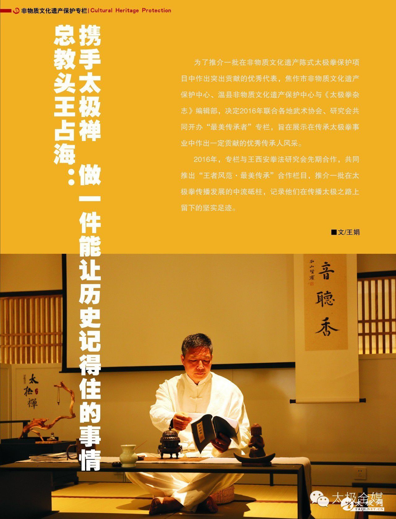 王占海是个有标签的人。 少年时他的标签是太极拳大师王西安的长子,必须以传承太极为任。所以,他从儿时一直到青年,就专心做一件事:苦练太极! 现在,人至中年,他又有了一个新标签:太极禅总教头。这个标签的背后自然承担着更重的责任。所以,开始笃志于太极拳传承,丝毫不敢懈怠。 2016年是太极禅成立的第六年。面对马云、李连杰、王占海三个人曾经的“五年之约”,以后的太极禅又有哪些新打算? “太极属于中国五千年哲学文化的范畴,太极拳是中国五千年文化肢体语言的一种表达形式。太极是中国的哲学,太极拳文化也是博大精深,包罗万相,而太极禅就是倡导一种更好的生活方式。”王占海就这样与我娓娓道来,说起了太极拳、太极禅的那些事。