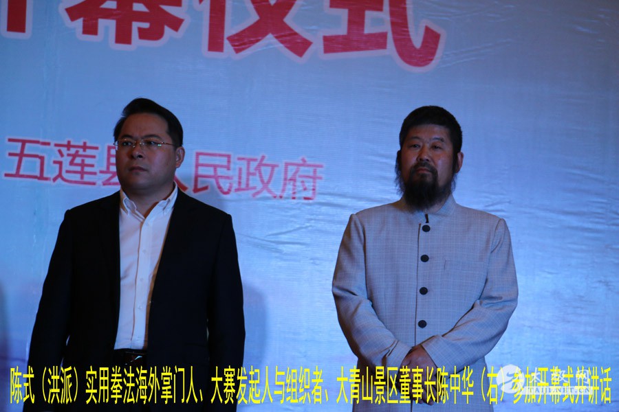 出席开幕式的有:山东省委巡视组组长蒋文彩、山东省侨办主任刘方会、山东省体育局副局长徐大义、山东省体育产业中心主任刘益民、山东省广播电视齐鲁网总编谭鲁民、日照市副市长郇梅、日照市体育局长黄秀芹、日照市侨办主任秦秀云、五莲县县委副书记、县长马维强、五莲县副县长赵荣芬、陈式太极拳实用拳法海外掌门人、香港大青山控股有限公司董事长陈中华。