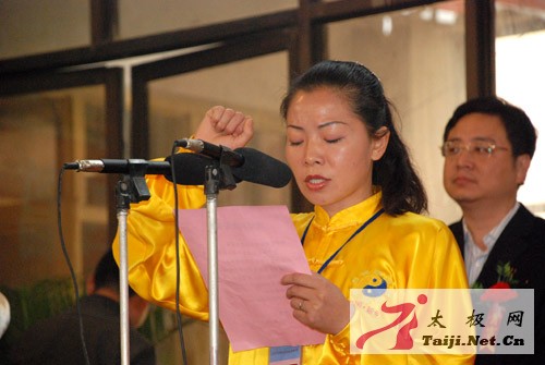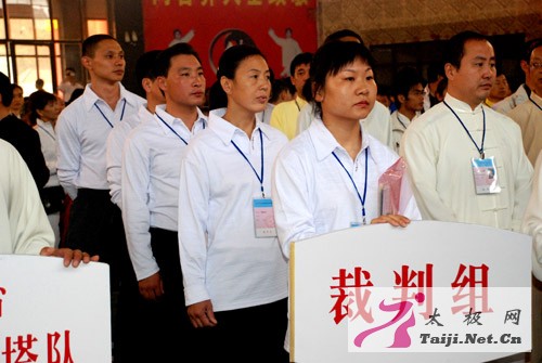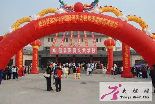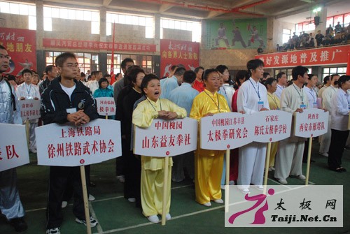 | 今天早上8点,2008中国陈家沟太极拳邀请赛在温县太极武术馆隆重开幕,来自全国各地一百多支参赛队、一千多名参赛运动员和嘉宾参加了开幕式。 焦作市体育局副局长常全旺,温县县委副书记、县长魏曰高,县委常委、县委办主任秦迎军,副县长孙菊梅,县政协副主席郑爱珍,太极拳大师王西安、朱天才出席了开幕式并在主席台就座,开幕式由县委办主任秦迎军主持。