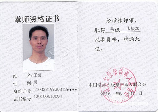 陈式太极拳传承人王健获得高级太极拳拳师证书