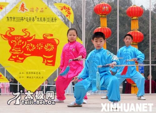 2月6日,一支儿童太极拳代表队在演练太极剑。当日,河南省焦作市举行了“迎新春”太极拳(剑)展示活动。来自全市各单位、社区和太极拳辅导站的29支代表队、600多名太极拳爱好者参加了表演。