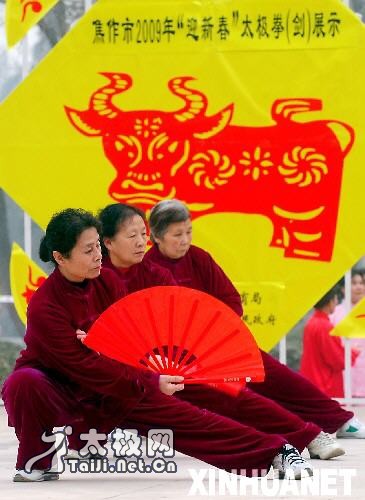 2月6日,一支太极拳代表队在表演太极扇。当日,河南省焦作市举行了“迎新春”太极拳(剑)展示活动。来自全市各单位、社区和太极拳辅导站的29支代表队、600多名太极拳爱好者参加了表演。 新华社记者王颂摄
