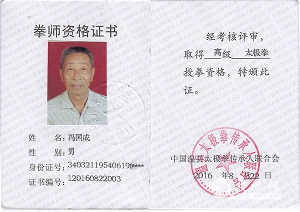 太极拳拳师资格证,是拳师授拳资格、技术水平的证明。经专家评审委员会评审,冯国成精通太极拳套路、器械教学,深入了解太极拳拳理拳法,并具备独立完成太极拳教学任务的能力,参加过国际国内及省级(含省级)以上太极拳赛事,取得优异成绩,特颁发《高级拳师资格证书》。 自幼跟随家门叔叔学习长拳,2000年经人介绍跟随蚌埠市体育学院校长陈庆峰老师学习陈氏尊古太极拳老架一路,二路,陈氏太极单剑,推手等。中途又跟随怀远县武术协会马媛老师学习竞赛套路24式,32式,42式,48式太极拳,32式太极剑。 2013年正式拜陈庆峰老师为师。多年来一直跟随陈老师在本地业余义务教拳。2015年5月在尊古太极拳比赛中获得老年组一等奖。冯国成对蚌埠地区太极拳传播做出了突出贡献。 责任编辑:太极网小田 |