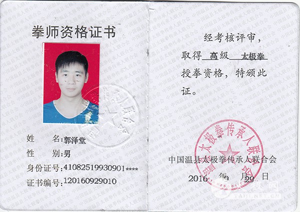 郭泽堂:陈家沟陈氏十九世太极拳嫡宗传人、太极拳“八大天王”之一陈志强老师入室弟子。生于1993年,河南省温县人,国家二级武术裁判、国家一级社会体育指导员、陈家沟太极拳研究会副秘书长、广州市花都区陈氏太极拳协会副会长、广州市陈志强太极拳推广中心副总教练。 2010年7月广东省传统武术锦标赛获得太极短器械金牌、太极长器械金牌。 12月被广州市花都区第六届运动会太极拳比赛聘为裁判员。 2011年3月“武德杯”第九届香港国际武术节获得男子陈氏太极剑第一名、太极春秋大刀第一名、陈氏太极拳竞赛类第一名、陈氏太极拳传统类第二名。 2011年8月广东省传统武术锦标赛获得太极春秋大刀金牌。 2012年4月北京 “陈照奎杯”武术太极拳比赛获得56公斤级推手第三名、双刀第三名。 2012年8月广东省传统武术锦标赛获得陈氏太极拳金牌、太极短器械金牌。 2013年8月焦作国际太极拳交流大赛获得陈氏太极拳金牌。 10月被聘为广州市花都区第四届老年人运动会太极拳比赛裁判员。 2015年6月首届“梦真杯”广府武术文化节暨推手争霸赛获得65公斤级推手冠军、无差别级 “王中王” 推手争霸赛亚军(师弟获得本届推手比赛总冠军)。 2015年8月8日广东(广州)第十一届体育节太极拳推手赛获得75公斤级推手冠军、无差别级“王中王”推手争霸赛总冠军。 2016年5月首届清远“顺盈杯”广东省陈氏太极拳精英赛荣获“优秀裁判员”称号。 2016年5月21日广州市“创尔生物杯”太极拳、械、推手比赛获得70公斤级推手冠军、无差别级“王中王”推手争霸赛总冠军。 2016年8月第六届世界太极拳健康大会获得陈氏太极拳金牌。 |