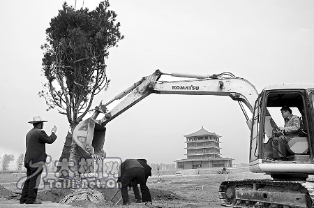 3月29日,园林工人在温县陈家沟中华太极拳博物馆周围栽树。日前,中华太极园核心景区建设项目在温县陈家沟启动,将建设太极广场、太极文苑、太极拳演绎场等9个项目,预计投资1800万元。