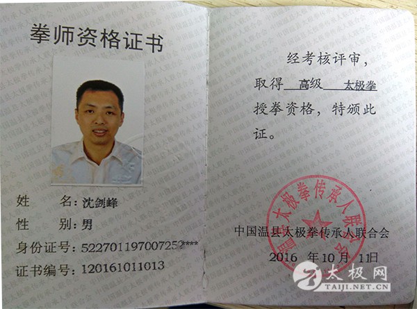 沈剑峰,陈家沟陈氏十九世太极拳嫡宗传人、太极拳“八大天王”之陈志强大师入室弟子。1970年07月25日出生,江苏省江阴人,现居住广东省佛山市顺德区、研究生学历、顺德区太极拳协会副队长,广东省武术协会会员,中国武术协会会员,中国武术六段,国家二级裁判员、陈家沟太极拳研究会副秘书长, 本人从小喜欢Chinese Kung Fu,在校期间习练过擒拿、格斗,1996年学习24式太极拳,2009年开始系统地学习陈氏太极拳套路、推手及各种器械,2014年拜陈家沟第十九代太极拳传人陈志强老师为师,2013年、2014年、2015年连续获得广东省传统武术竞标赛、广东省武术精英赛太极拳、剑一等奖(金牌)。 |