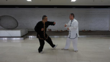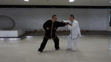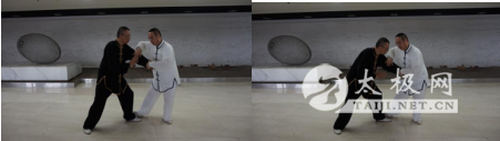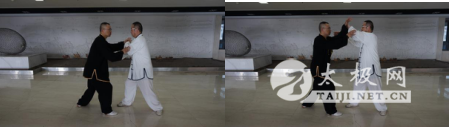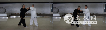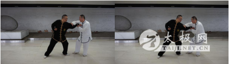 招术二,浪遏飞舟 合步推手,划圈打轮,对方挤掤,我吞化对方掤劲,左挈右捋将对方“引进”,对方为稳固身形倏然回撤,我旋即沉胯,胸腰折叠,右腕转关,折出凸击,劲出似浪头拍岸,将对方发出。所谓“轻抹如同弓上箭,放开亦似箭离弦”【图2-1至图2-12】。 图2-1 图2-2 图2-3 图2-4 图2-5 图2-6 图2-7 图2-8