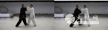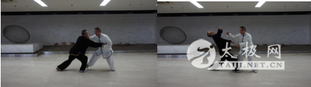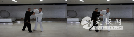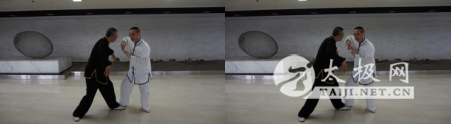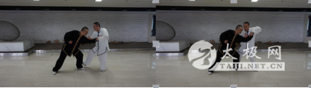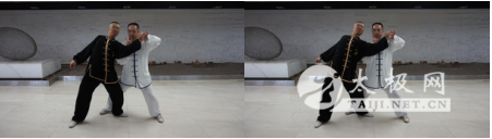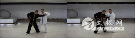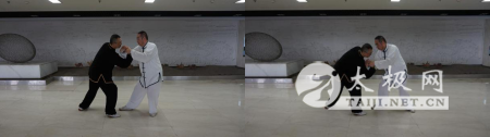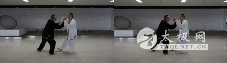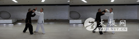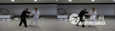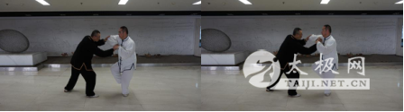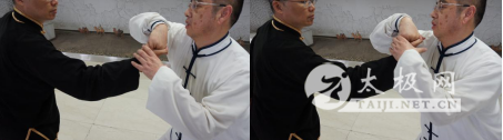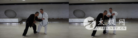招术三,疾风断枝 合步推手,划圈打轮,彼以按来,我挤化续上掤引,左手转腕扣握其右腕,右掌根贴其肘弯处,走横圆螺旋,向下划弧,三节分家瞬猛双按下採,使对方跌扑或脱臼。所谓“疾风劲吹平静时,不静不见断其枝”【图3-1至图3-8】。(注意,只可小臂和手腕瞬间下採劲,大臂和肩不可用力) 图3-1 图3-2 图3-3 图3-4 图3-5 图3-6 图3-7 图3-8