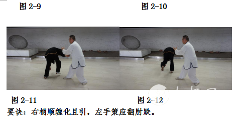 招术一,先礼后兵 旧时,国人相见礼节为双方抱拳施礼。19世纪末西风渐进,握手礼成行。武林之人相见行握手礼时,对方手掌使劲、使招以试我之功夫或挑衅我,为此,“单鞭”之“万法礼祖”解之。 双方右手相握,对方突加力握拿,我即左手挟其右腕,左右双逆缠(似拧毛巾状)右手上折合劲,同时左转;对方手腕被折拿身体右倾跌进,我顺势右肘迎击其首。这叫“前打一丈不为远,近打只在一寸间”【图1-1至图1-10】。 招术二,老僧托钵 合步推手,划圈打轮,对方双手紧抓我右小臂,恃力推按。我沉胯、含胸、收腹,右手梢节领劲顺缠化引,必致其身形左倾,趁时右手下引,胯右转,同时左手托其右肘翻其肘,对方失重跌出。所谓“阴阳开合妙入微,一汪池塘凭鱼飞”【图2-1至图2-12】。 招术三、白马翻蹄 合步推手,划圈打轮,对方双手突抓我右小臂,恃力推按。我沉胯微右转,双手顺缠,左进右撤相搓,稍挫其锐,左手顺势反勾其左腕下挂使我右手得脱,旋向右划弧凸腕击其左面颊。真是“回转诸势来不及,惟用翻蹄最适宜”【图3-1至图3-18】。 招术四,苏武挥鞭 推手中, 此招术可分肩靠和肘击两种用法。 1、肩靠 合步推手,划圈打轮,调整右步上左步,以己左胯制住对方右后侧胯,占据要津,阻其后撤,右手拿住对方右腕,左手“以手领身”,粘其右臂沉肘逆缠,微右旋俯而下引,时已得机,遂左手顺缠竖掌引肩“靠”击。所谓“弓弦一卸屈而张,一缕中气随势扬”【图4-1至图4-8】。 2、肘击 合步推手,划圈打轮,调整右步上左步,以己左胯制住对方右后侧胯,占据要津,阻其后撤,右手拿住对方右腕,左手“以手领身”,粘其右臂沉肘逆缠,微右旋俯而下引;时已得机,遂左转肘击。所谓“三节钢鞭肩肘手,随机应变向外走”【图4-9至图4-18】。 散手实战中,对方疾拳直冲,我右手走逆缠接,同时上左步,以己左胯据对方右后侧胯,右手粘住对方右腕,左手“以手领身”,粘其右臂,微右旋俯而下引,时已得机,遂左手顺缠竖掌引肩靠,一击!左手逆缠接肘击,再击!左手继逆缠领劲开臂,将对方“跌空合出”,三击【图4-19至图4-37】。 “单鞭”一势的招法紧凑、跌宕,步法与身法相辅协动,“以手领劲”,迭施有序,“引”而后发;虽言“感而后应”,我亦先声夺人,出招有取胜之法,锋镝即指,伏而莫纵。 责任编辑:太极网孔春红 |
