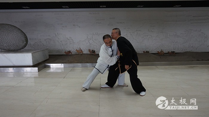 合步推手,划圈打轮。互掤转换之际,我撤右步上左步,封其身后,蹩其右腿,阻其后撤;同时左臂乘隙迂缠其腰;右掌蓄于胸前,松腰沉胯扣左膝,裆走下弧,右掌击推对方右肋部将对方击出,或用肩靠劲将对方靠出。所谓“两手平分两足开,右前左后击胸怀”【图2-1至图2-12】。 图2-1 图2-2 图2-3 图2-4 图2-5 图2-6 图2-7 图2-8 图2-9 图2-10 图2-11 图2-12 散手实战中,对方直拳当胸袭来,我上右步外接其腕,顺势旋荡其臂致其前跌,对方落空欲收势后撤,我迅疾上左步插其身后,蹩其右腿,阻其后撤;同时左臂乘隙迂缠其腰;右掌蓄于胸前,松腰沉胯扣左膝,裆走下弧,右掌击推对方右肋部将对方击出,或用肩靠劲将对方靠出【图2-13至图2-23】。 图2-13 图2-14 图2-15 图2-16 图2-17 图2-18 图2-19 图2-20 图2-21 图2-22 图2-23 要诀:调整重心插左步,裆走下弧挨即飞。 此招术是“搂膝右击”的变招。推手与散手中皆可使用。散手中,对方直拳当胸袭来,我上右步外接其腕,顺势上左步插其身后,蹩其右腿,阻其后撤;左臂逆缠前插束其前腹,松腰沉胯扣左膝,左臂“梢节领劲”顺缠,上下合劲,对方即刻跌出。所谓“乾坤正气运鸿蒙,拳术玄妙在天神”【图3-1至图3-12】。 图3-1 图3-2 图3-3 图3-4 图3-5 图3-6 图3-7 图3-8 图3-9 图3-10 图3-11 图3-12 要诀:随机应变末拘泥,后缠前束皆制敌。 “斜行拗步”的实用技法,体现了太极拳以巧胜强的技击特点,即“行”,就要“行必果”,穿插要到位;注意控制自身的重心、上下的配合,动作要轻灵,开合走缠丝,方能“出其不意攻其无备”! 文章来源:《中华武术》 本站责任编辑:安安 |