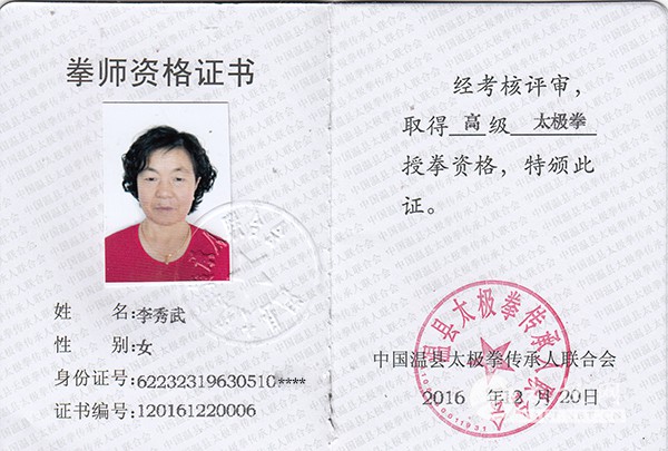 李秀武,女,汉族、生于1963年5月。甘肃古浪人,自2000年开始通过光碟习练国家统编套路及器械、养生太极掌等。 2015年跟随陈氏第十三代传人王宗大老师系统学习陈式太极拳传统套路、剑、刀等器械。在2015年参加甘肃省体彩杯传统武术大赛中,其参赛的陈氏太极拳、剑获得优异成绩。 拳照 |