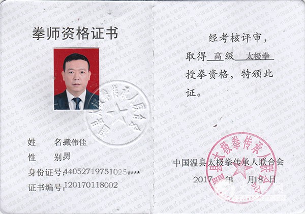 戴伟佳,1997年开始习练南拳,2005年开始习练杨式太极拳及太极器械,2008年开始习练陈式太极拳及太极器械,2013年开始授拳。普宁(粤东)陈式太极拳协会常务副会长,助理教练,粤东(普宁)王西安拳法研究会助理教练。