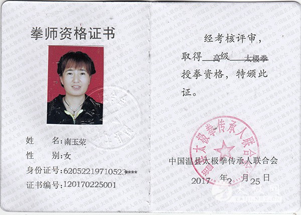 南玉荣,女,生于1971年,甘肃省兰州市人,中华传统武术优秀传承人,武林名家。中国武术协会会员,武术六段,国家武术段位制指导员、考评员。甘肃省城关区武术运动协会副会长、竟训部部长。社会体育一级指导员。杨式太极拳第六代传人,师承杨式太极拳第五代传人张世昌先生。 自幼喜好武术,近三年来开始参加各种国际、省级太极拳赛事,个人获得金、银牌无数。其中:2016年武当演武大会中获得杨式太极拳第一名一等奖、武当剑第二名一等奖。甘肃.兰州国内精英赛太极拳女子全场第一名一等奖、武当剑第一名一等奖,甘肃首届“丝绸之路.长城论剑”传统武术锦标赛拳、剑均第一名一等奖。集体奖项金牌共18枚。 比赛的成绩只能证明自己所付出的汗水,不能代表自己的价值所在,所以在自己不断成长的过程中,积极响应国家《2030规划刚要》,努力打造大健康—大平台—大数据—大服务的文化产业链,希望更多的人走进太极,了解太极文化,陶冶情操,积攒健康! 传播太极,传播健康,发扬中华传统文化,将是我太极路上的永久方向! |