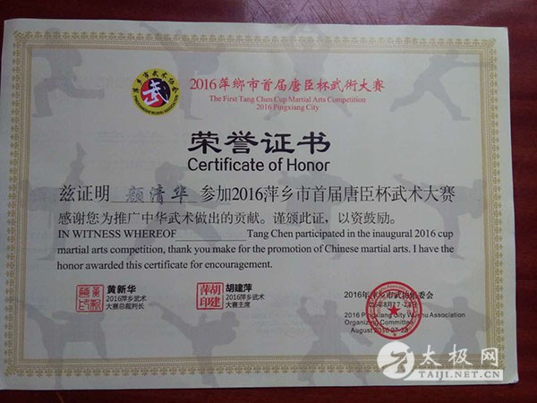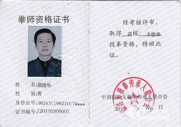 陈式太极拳小架一层架 颜清华,男,1962年10月出生,江西省莲花县人,大学本科。自幼随父习练岳家拳,曾习练峨眉铁砂掌和少林易筋经,后拜河南温县陈家沟陈氏太极拳第十一代正宗传人陈春生先生为师,专练陈氏太极拳小架,并得到师爷陈伯祥先生指点,深得陈氏太极拳小架拳理和功法,拳架纯正。现为温县陈氏太极拳陈伯祥拳术研究会会员,中国武术协会会员,江西省萍乡市武术协会会员,国家二级武术裁判,国际太极拳高级教练和高级拳师。2012年获江西省首届武术比赛陈氏太极拳一等奖;2013年4月获央视武林大会走进陈家沟陈氏太极拳二等奖;2016年8月获萍乡市首届唐臣杯武术比赛陈氏太极拳第二名;2016年11月获中国普陀国际武术比赛陈氏太极拳第一名;2017年3月获第二届陈家沟陈氏小架陈伯祥拳术交流大会优秀奖。 获奖证书 |
