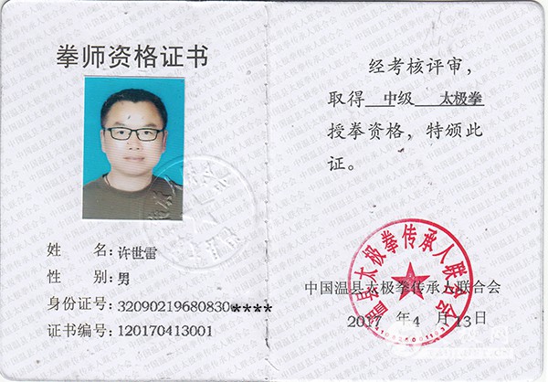 2008年跟随陈小旺大师在盐城的弟子习练陈氏太极拳。 2010年8月江苏省"国检杯"太极拳大赛获得太极拳一等奖 2012年首届陈家沟陈氏太极拳国际交流大赛获得陈氏太极拳太极拳一等奖、太极单刀二等奖。 2014年江苏省第三届演武会大赛获得陈氏太极拳太极拳一等奖、太极单刀一等奖。 2013年开始建立陈氏太极盐城辅导站,开始推广教学。并多次参加东武太极研修院举办的太极拳高级研修班,2015年正式建立东武太极盐城辅导中心。 2016年拜太极名家张东武老师为师,成为陈氏太极拳第十三代传人。 |