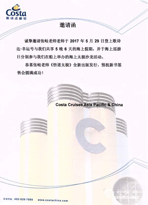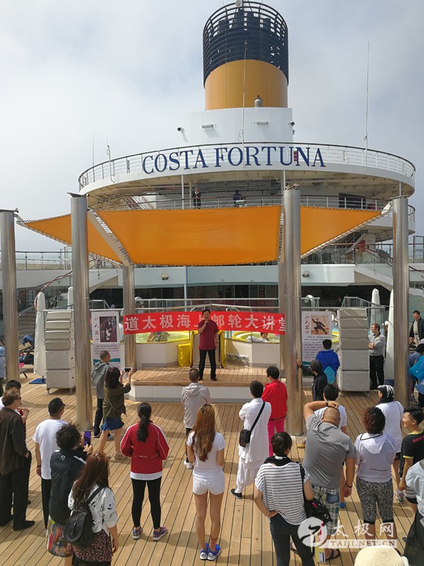 (太极网报道)2017年5月29日至6月3日,世界太极拳联谊会常务理事、中国辽宁分会会长,太极网2016年度十大影响力人物,辽宁省太极拳推手研究会副会长、沈阳悟道太极文化传媒有限公司董事长张岐应意大利歌诗达邮轮公司盛情邀请,并在游够天下国际旅行社的大力支持下,率领陈氏太极拳第十二代优秀传承人沈玉明、姜锡哲、聂洪齐、李丽晶、马显现携手意大利歌诗达邮轮公司“幸运号”在船上成功举办“劈波斩浪一带一路传拳海外,悟道太极海上邮轮讲堂开课”活动! 大讲堂上已出版《悟道太极》专著的张岐老师系统讲解了太极文化理念,以及太极拳理、拳法,太极拳的起源传承发展现状。沈玉明、姜锡哲、聂洪齐、李丽晶、马显现师兄妹先后教授了太极放松功,精典陈氏九式太极拳,来自海内外众多太极拳习练者,爱好者热情高涨,积极参予,对博大精深的国粹传统太极文化有了更深刻的感悟,学习中一丝不苟,神情专注,在全民健身运动中,真正认识到,习练太极拳,健康过一生的养生理念。 来自国内各地及海外的百余名太极拳习练者、爱好者积极参加了此次大讲堂活动。邮轮上逾三千名中外游客及来自世界五十多个国家和地区的近千名工作人员,共同见证并感受到了太极拳这一博大精深的中华民族优秀传统文化,大讲堂达到了弘场中国传统文化,广泛传播国术精粹的目的,大讲堂的课程及几位师兄弟妹的表演,深深地感染和激发了船上游客,强身健体,习练太极的锻炼欲望,课上、课下大家纷纷表达出了强烈的学习热情! 责任编辑:太极网小洁  |