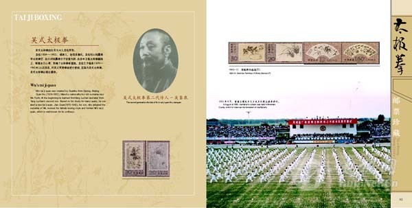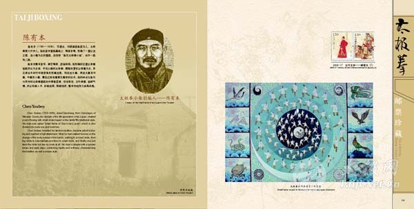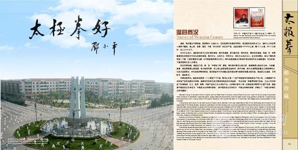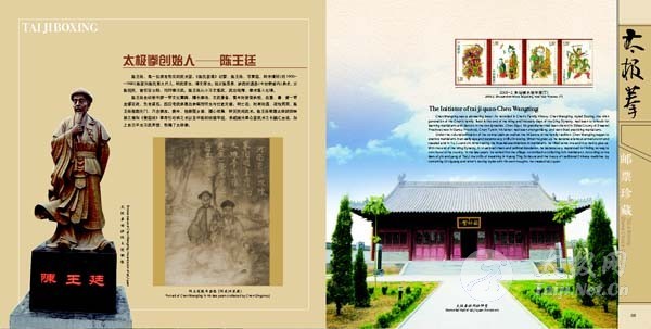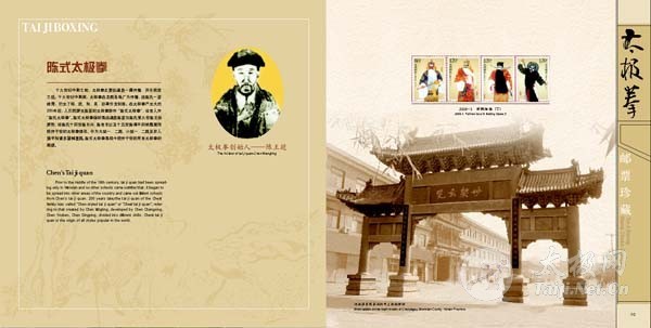 | 为喜迎焦作“一赛一节”,深挖太极拳“根”文化、整合太极各类资源,进一步向世界各国人士推广温县太极拳及太极拳宗师,扩大并巩固其国际影响力,温县邮政局印制的《太极拳》邮票珍藏册将于7月底与广大太极拳爱好者见面。 《太极拳》邮票珍藏册将太极拳文化以邮票和邮册为载体,利用方寸世界折射出太极拳深厚的文化底蕴及其宗师的世代影响力,具备独有的保值增值功能,并将以浓缩的文化提升温县太极拳文化的功能。该珍藏册内容以太极拳为主题,将政府形象、太极拳历史文化、陈家沟文化底蕴和精神融入到邮册中,配以精心挑选与制作太极拳相接近的邮票,并专门制作个性化邮票,重点突出政府、太极拳、陈家沟形象。其中,包括古老的陈家沟、太极拳创始人陈王廷以及各流派代表人物等太极拳个性化邮票。可作为企事业单位对外接待用品,是太极拳爱好者和集邮爱好者的收藏佳品。