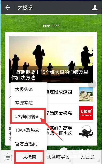 太极网名师问答平台开通啦! 首创太极拳知识问答价值分享模式! 为广大拳友与名师名家搭建 有价值的交流互动平台。 提问方式: 1、关注“太极拳”微信公众号,从底部菜单进入