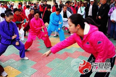 | 9月26日,在银川市兴庆区中山公园,北京理工大学讲师、太极拳世界冠军邱慧芳正在为晨练的群众进行太极拳辅导。 当日,为推动全民健身活动的深入开展,国家体育总局举办的“武术西部边疆行活动”专家组一行,在银川市、石嘴山市等地对武术健身爱好者进行辅导交流。 |