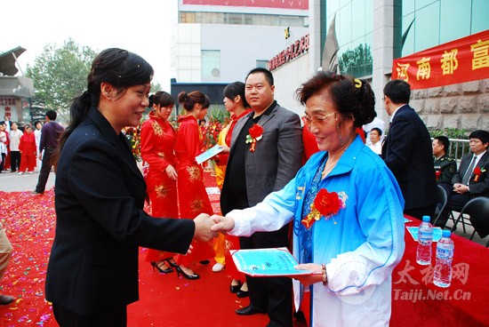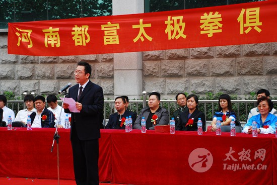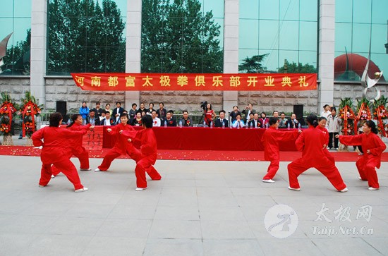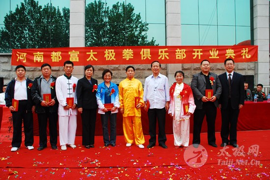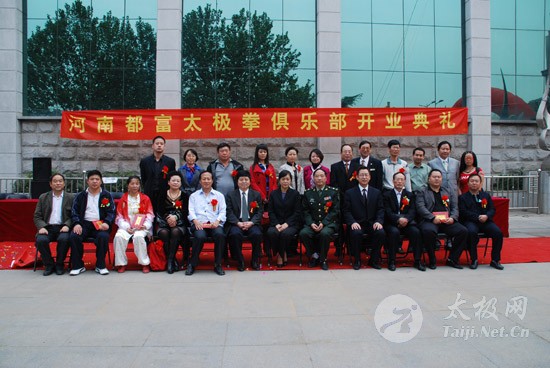 | 2009年10月26日重阳节这天,河南都富太极拳俱乐部在郑州泰隆大厦隆重开业。开业仪式上,来自社会各界的知名人士、学者纷纷到会祝贺,除精彩的太极拳、械表演外,书画界的名家汇聚一堂举行笔会,为都富太极拳俱乐部的开业增添浓厚了的文化氛围。