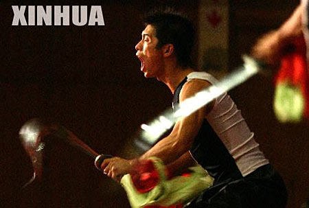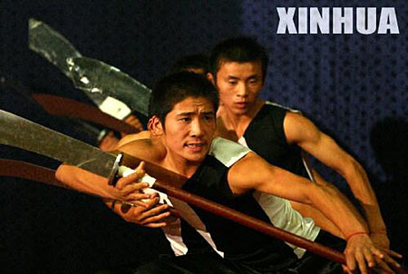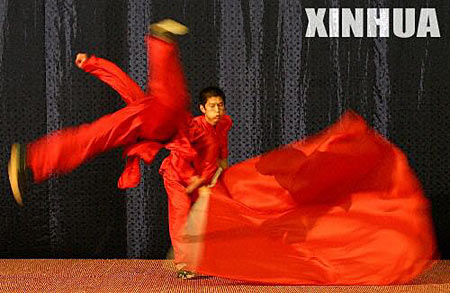 | 7月22日,在赞比亚首都卢萨卡的穆隆古西国际会议中心,两名中国山东武术团的队员在表演中国功夫--大旗跟斗。山东武术团此次访问演出是中赞两国政府2002年签订的文化合作协定3年执行计划的一部分,同时也是为了庆祝赞比亚独立40周年和中赞建交40周年。赞比亚于1964年10月24日独立,同年10月29日与中国建交。